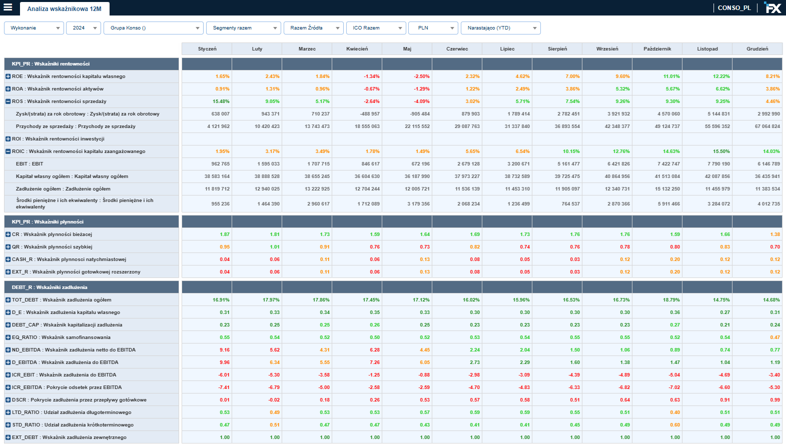 Fincorex® pozwala na tworzenie i monitorowanie wielu wskaźników finansowych, dotyczących takich obszarów jak: rentowność przedsiębiorstwa, płynność finansowa, struktura zadłużenia i kapitału.
